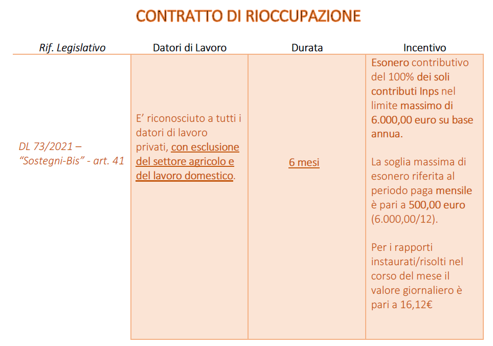 In via eccezionale, dal 1° luglio 2021 e fino al 31 ottobre 2021 è istituito il contratto di rioccupazione quale contratto di lavoro subordinato a tempo indeterminato diretto a incentivare l’inserimento nel mercato del lavoro dei lavoratori in stato di disoccupazione, nella fase di ripresa delle attività dopo l’emergenza epidemiologica.
